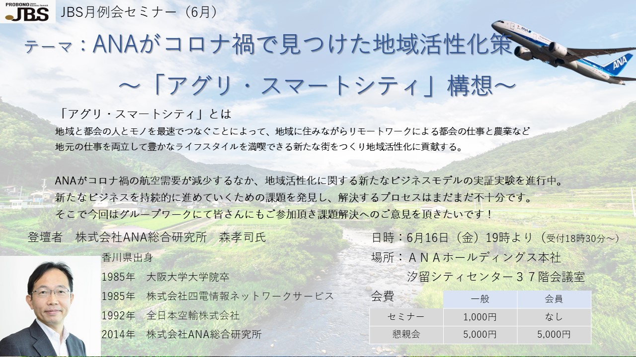 6月のJBS月例会のテーマは「ANA がコロナ禍で見つけた地域活性化策~「アグリ・スマートシティ」構想」です。