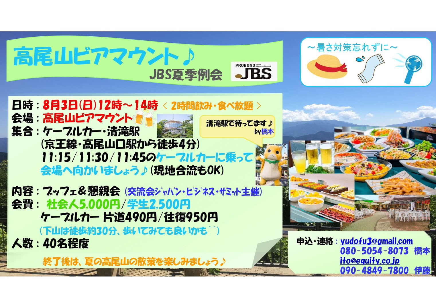毎年恒例となっているJBSのBBQの社会人と学生の交流会は、今回は都心からもアクセスしやすい「高尾山ビアマウント」での開催となりました!