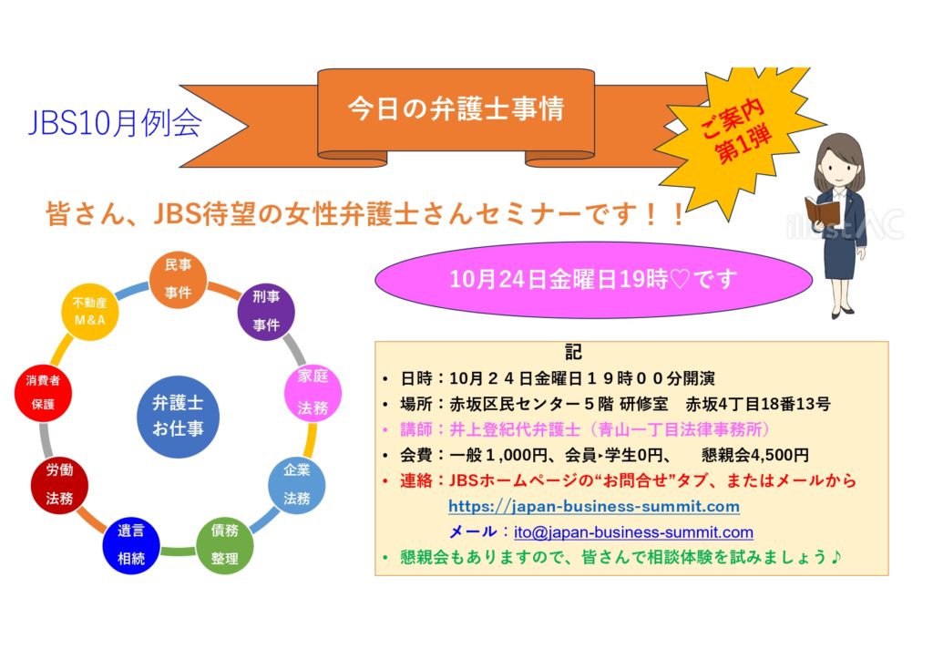 10月の月例会のテーマは弁護士の方による「今日の弁護士事情」です。